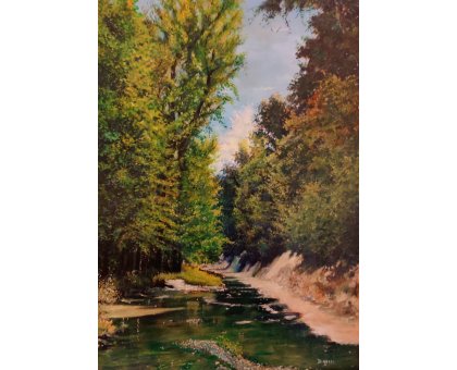 OLIO SU TELA MASSIMO BIGAZZI ' SULLE SPONDE DEL MIO TORRENTE ' dimensioni L 50 x H 70 cm.