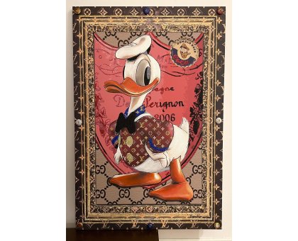 MIXED MEDIA SU TELA BEPPE RANICA ' DONALD DUCK IN DOM PERIGNON ' dimensioni L 70 x H 105 cm.