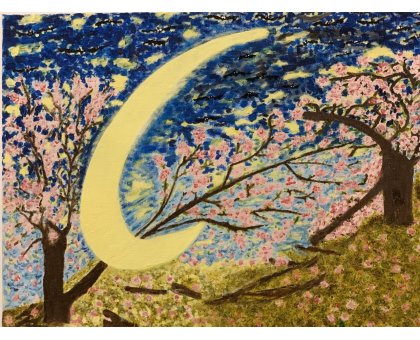 OLIO SU TELA LUCIA LEPORATTI ' LA LUNA CHE RIPOSA SUL PESCO ' dimensioni L 40 x H 40 cm.